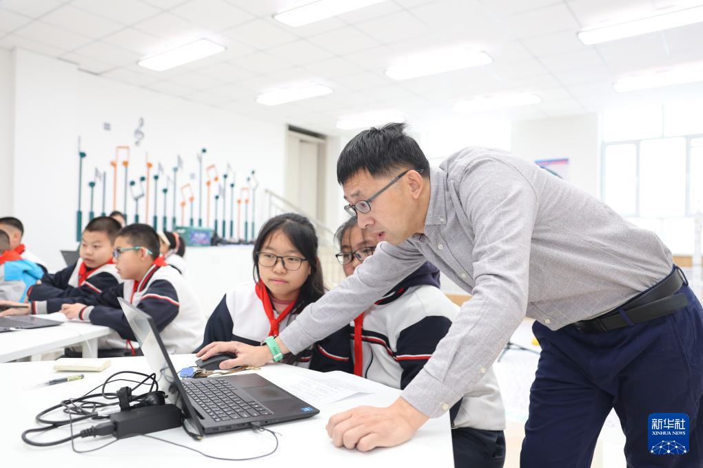 在新疆生产建设兵团第二中学第十一师分校,天津援疆教师杨磊在辅导“趣”编程社团学生(12月19日摄)。