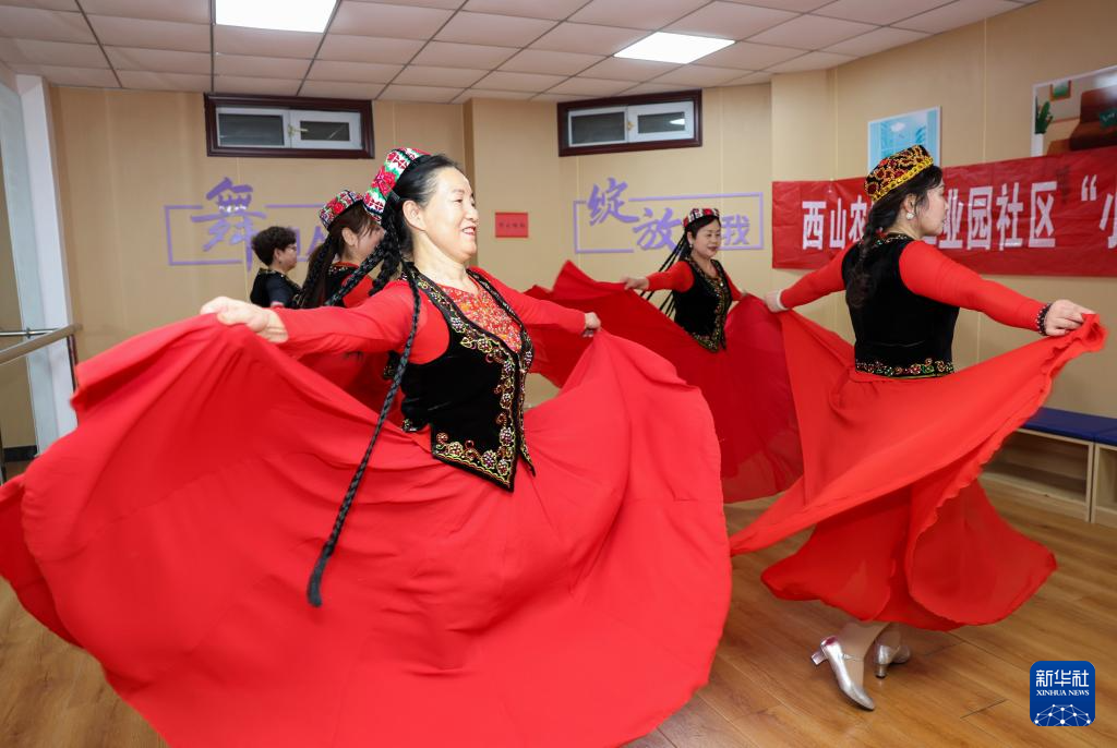 居民在新疆生产建设兵团第十二师西山农牧场工业园社区文化活动室跳舞(12月20日摄)。该社区文化活动场所由山东援建。