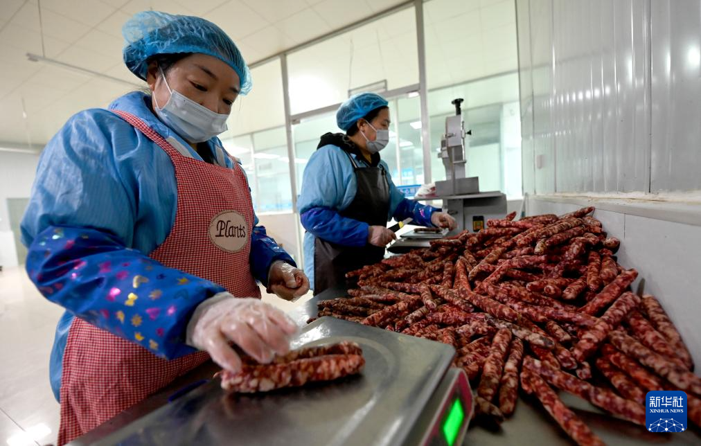 12月24日,陕西一家食品科技发展公司的工作人员在陕西省汉中市镇巴县小洋镇绿色产业园食品加工厂称量腊肠。