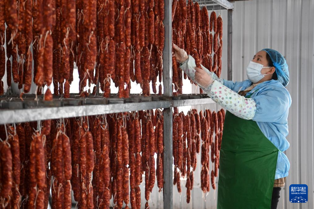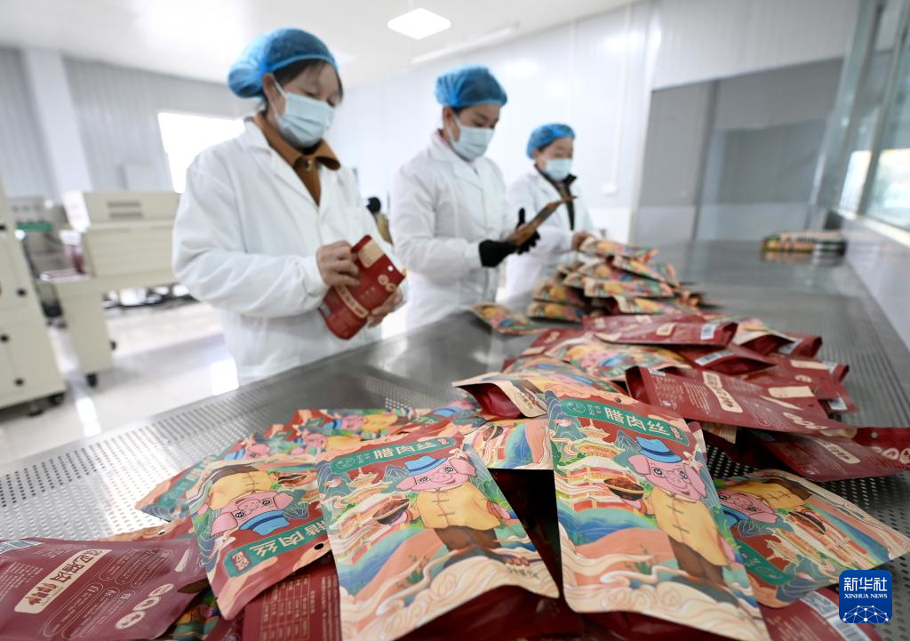 12月24日,陕西一家食品科技发展公司的工作人员在陕西省汉中市镇巴县小洋镇绿色产业园食品加工厂晾制车间检查产品。