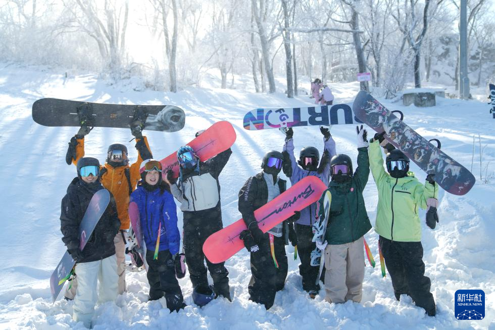 滑雪爱好者在吉林省吉林市万科松花湖度假区合影留念(11月18日摄)。