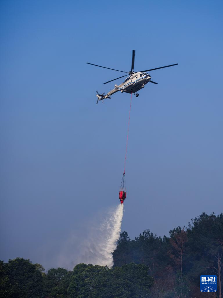 12月26日,在四川省成都市蒲江县,消防员驾驶直升机在演练现场进行吊桶洒水灭火作业。