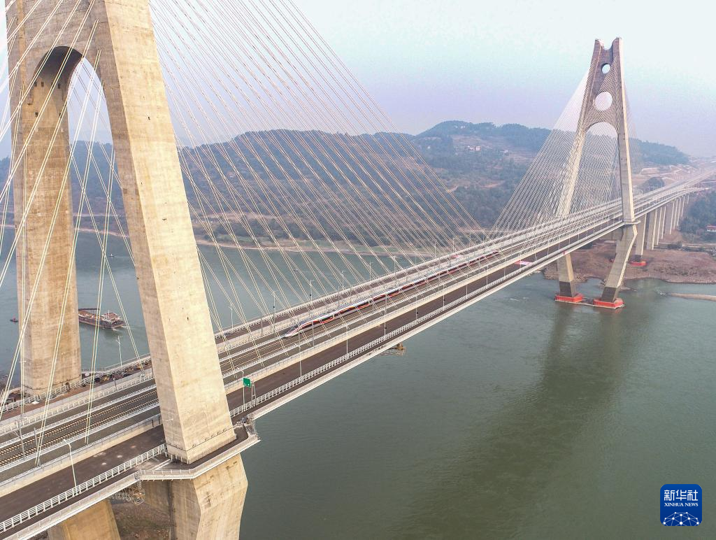12月26日,一列复兴号动车组列车行驶在成自宜高铁宜宾临港公铁两用长江大桥上(无人机照片)。