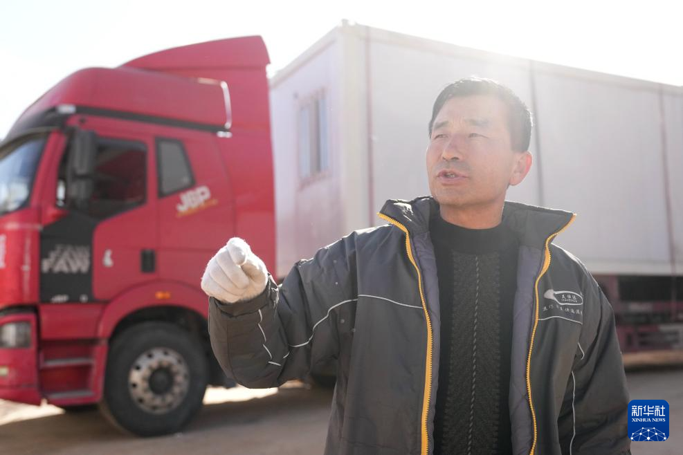 12月26日,马明在自己的货车前等待活动板房卸货。