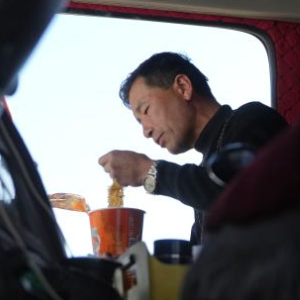 12月26日,在积石山县柳沟乡一活动板房转运点,马明排队等待卸货时匆匆吃午饭。