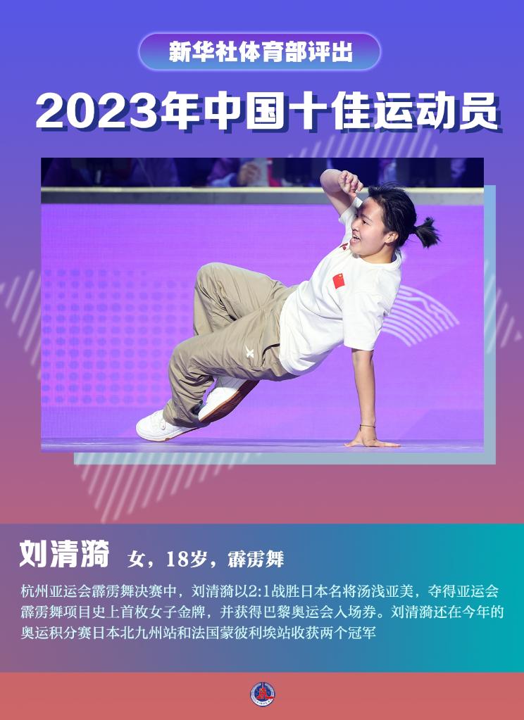 杭州亚运会霹雳舞决赛中,刘清漪以2:1战胜日本名将汤浅亚美,夺得亚运会霹雳舞项目史上首枚女子金牌,并获得巴黎奥运会入场券。刘清漪还在今年的奥运积分赛日本北九州站和法国蒙彼利埃站收获两个冠军。