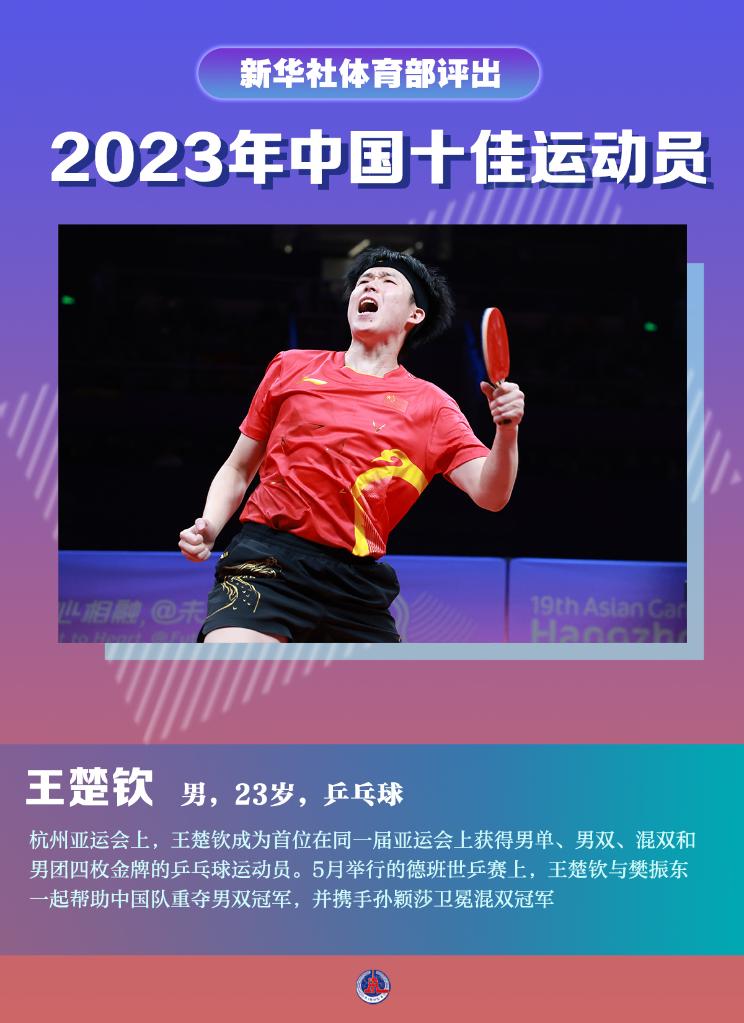 杭州亚运会上,王楚钦成为首位在同一届亚运会上获得男单、男双、混双和男团四枚金牌的乒乓球运动员。5月举行的德班世乒赛上,王楚钦与樊振东一起帮助中国队重夺男双冠军,并携手孙颖莎卫冕混双冠军。