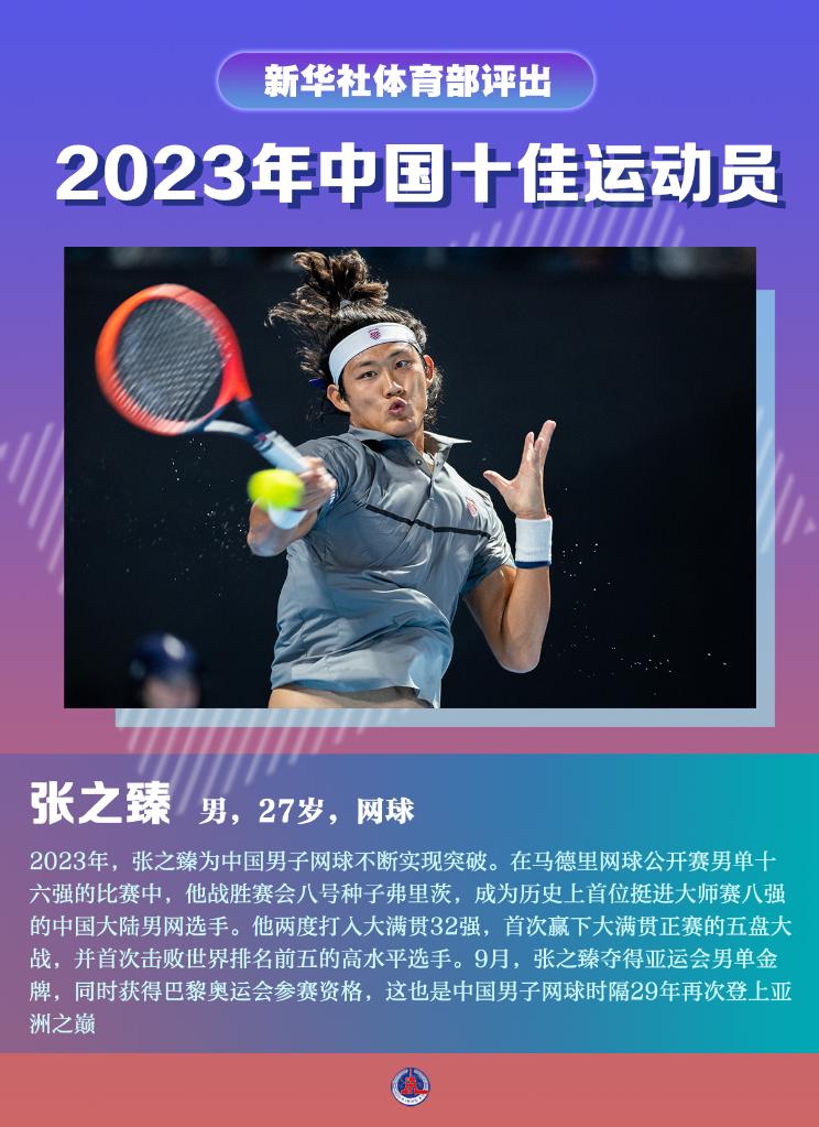 2023年,张之臻为中国男子网球不断实现突破。在马德里网球公开赛男单十六强的比赛中,他战胜赛会八号种子弗里茨,成为历史上首位挺进大师赛八强的中国大陆男网选手。他两度打入大满贯32强,首次赢下大满贯正赛的五盘大战,并首次击败世界排名前五的高水平选手。9月,张之臻夺得亚运会男单金牌,同时获得巴黎奥运会参赛资格,这也是中国男子网球时隔29年再次登上亚洲之巅。