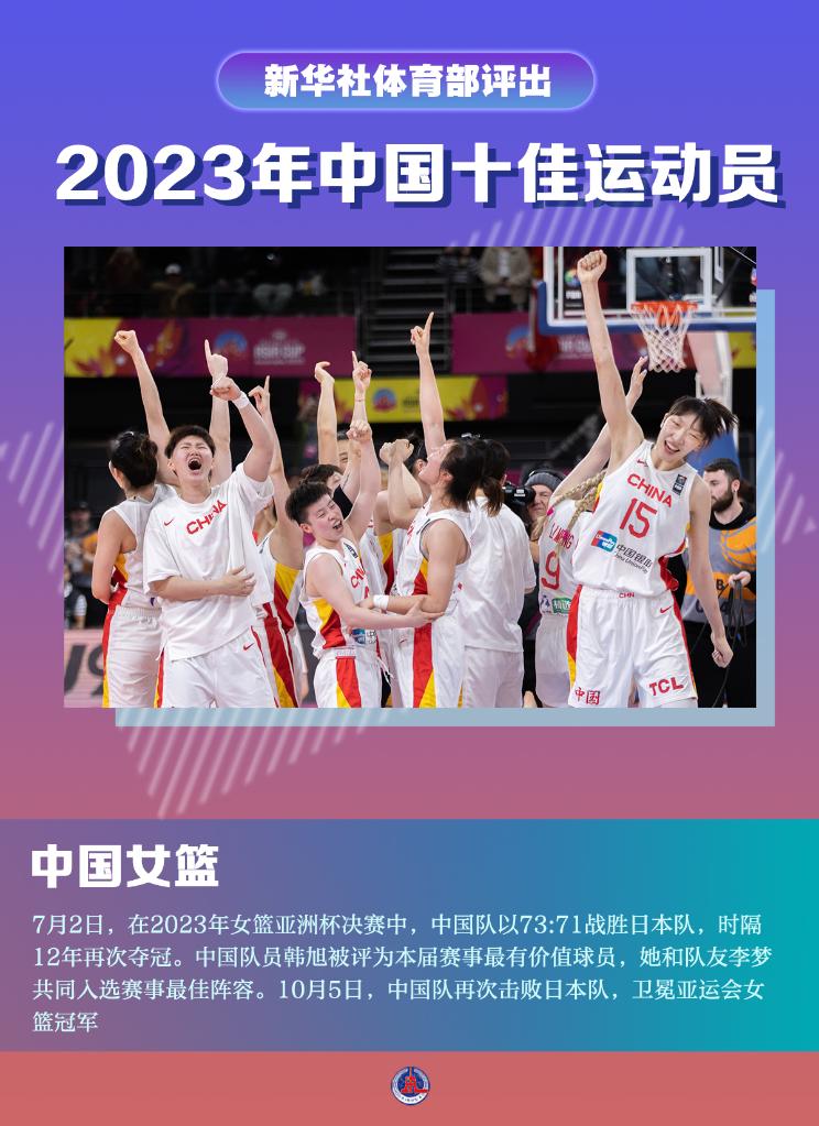 7月2日,在2023年女篮亚洲杯决赛中,中国队以73:71战胜日本队,时隔12年再次夺冠。中国队员韩旭被评为本届赛事最有价值球员,她和队友李梦共同入选赛事最佳阵容。10月5日,中国队再次击败日本队,卫冕亚运会女篮冠军。