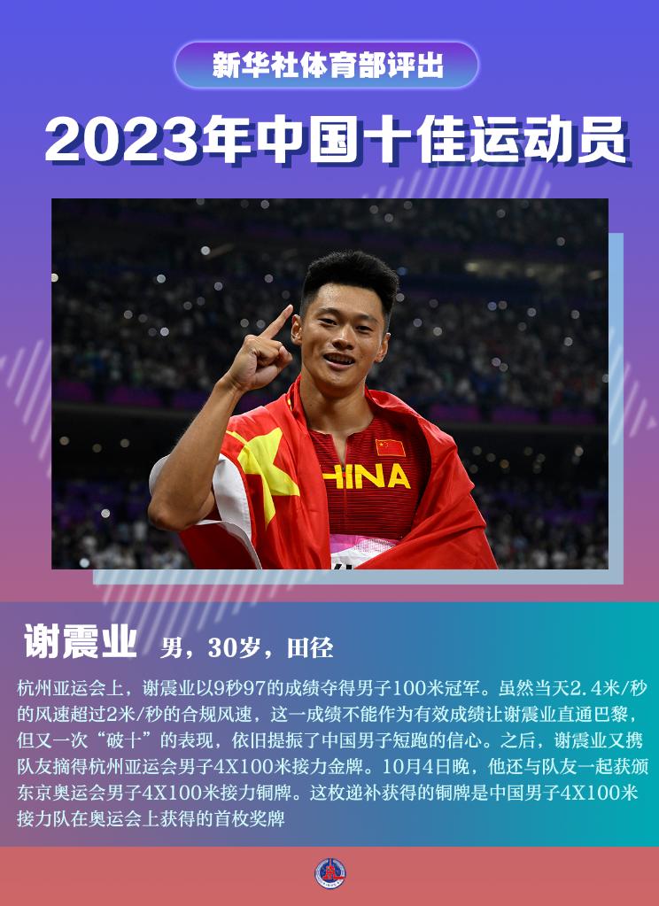杭州亚运会上,谢震业以9秒97的成绩夺得男子100米冠军。虽然当天2.4米/秒的风速超过2米/秒的合规风速,这一成绩不能作为有效成绩让谢震业直通巴黎,但又一次“破十”的表现,依旧提振了中国男子短跑的信心。之后,谢震业又携队友摘得杭州亚运会男子4X100米接力金牌。10月4日晚,他还与队友一起获颁东京奥运会男子4X100米接力铜牌。这枚递补获得的铜牌是中国男子4X100米接力队在奥运会上获得的首枚奖牌。