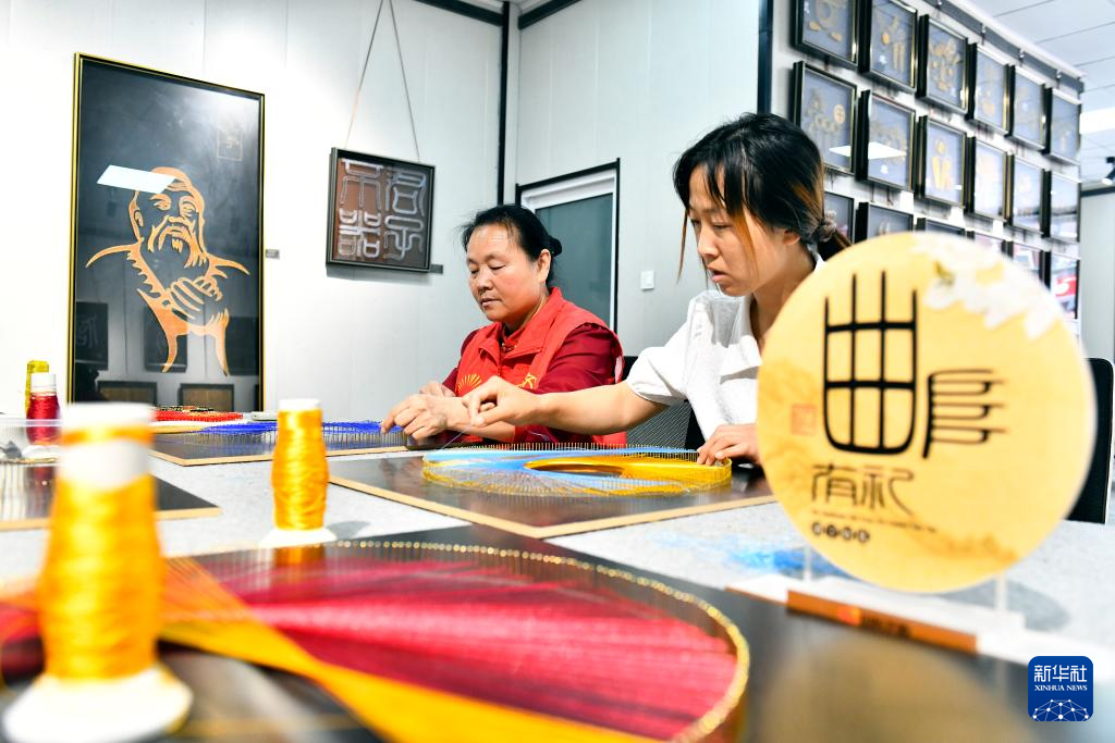 山东曲阜市尼山镇鲁源新村工作人员在制作弦丝画(2023年6月8日摄)。
