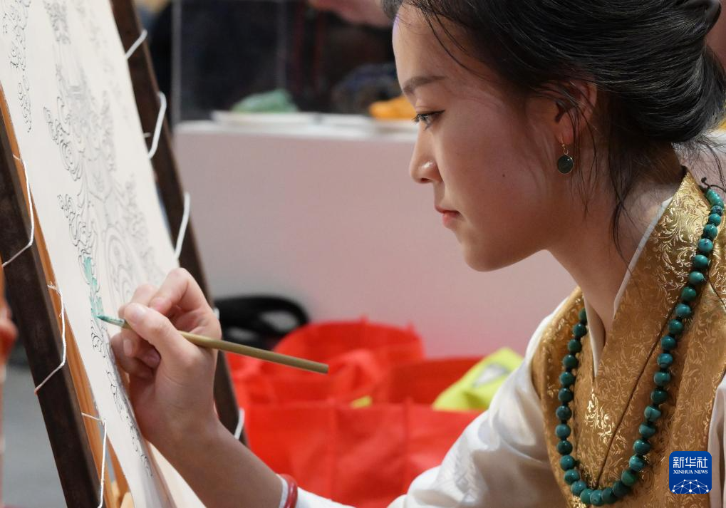 12月27日,一位画师在展览现场展示传统热贡唐卡的绘制工艺。