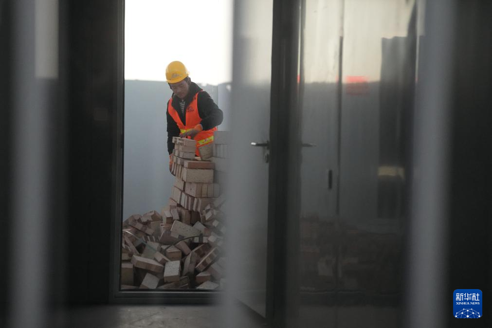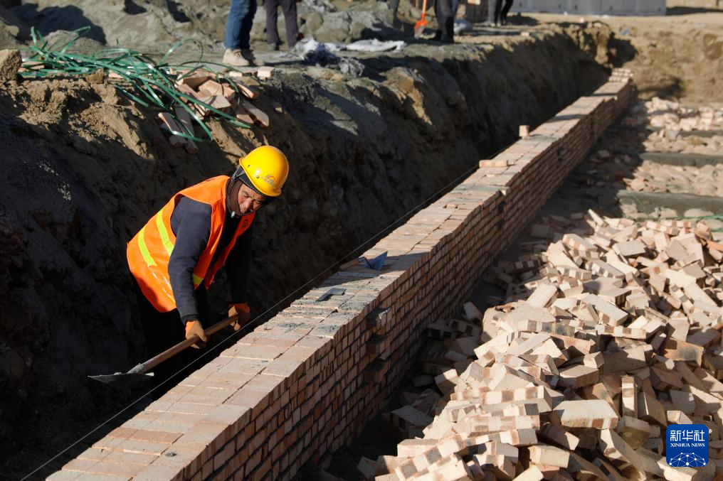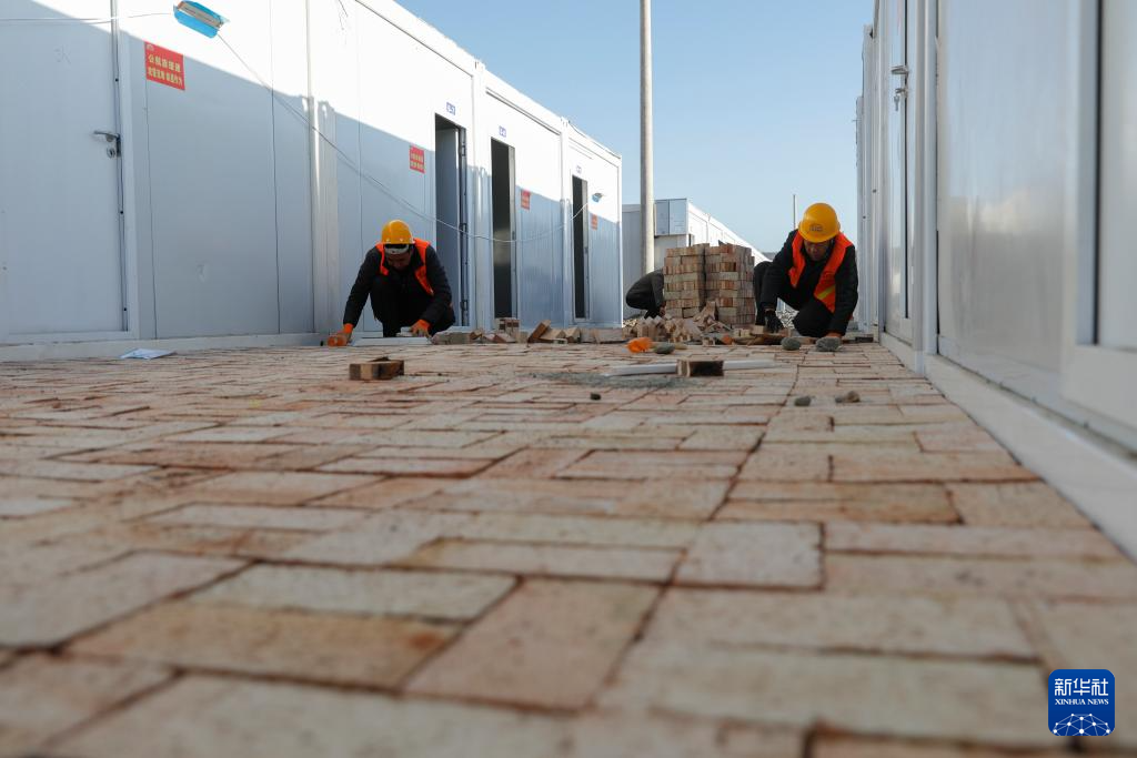 12月27日,在积石山县吹麻滩镇集中安置点,甘肃省公航旅集团施工人员在建造安置点公共厕所。