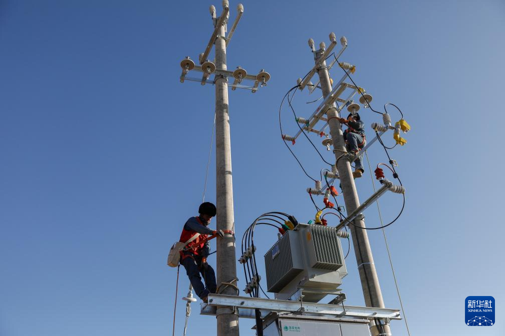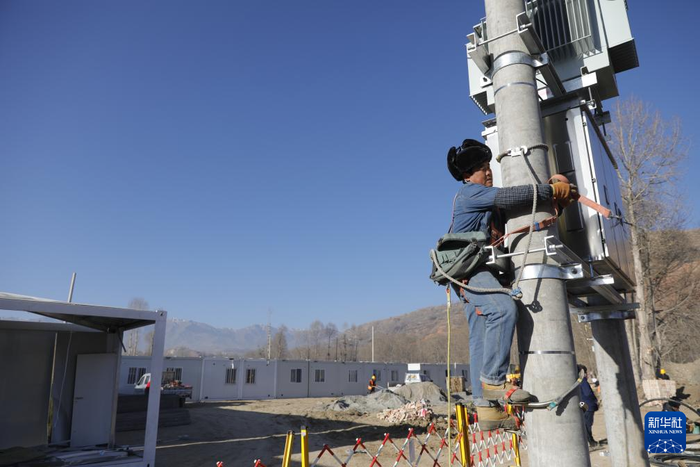 12月27日,在积石山县吹麻滩镇集中安置点,国家电网工作人员在对安置点进行通电作业。