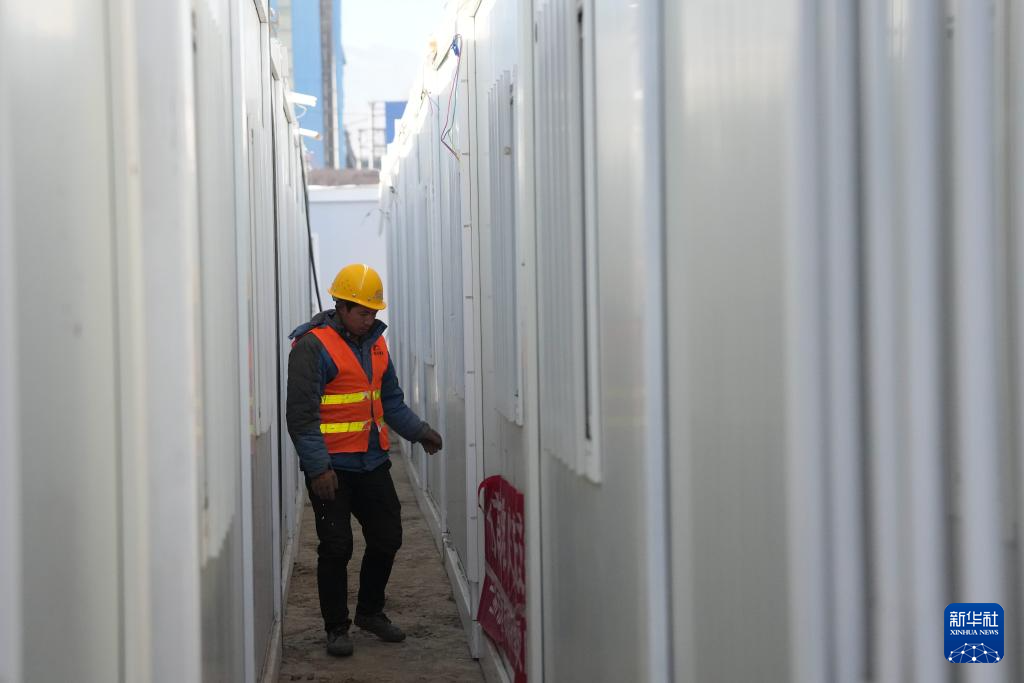 12月27日,在积石山县吹麻滩镇集中安置点,甘肃省公航旅集团施工人员在检查板房情况。