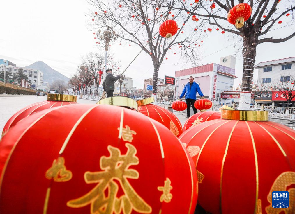 12月27日,工作人员在河北省迁西县城区悬挂灯笼。