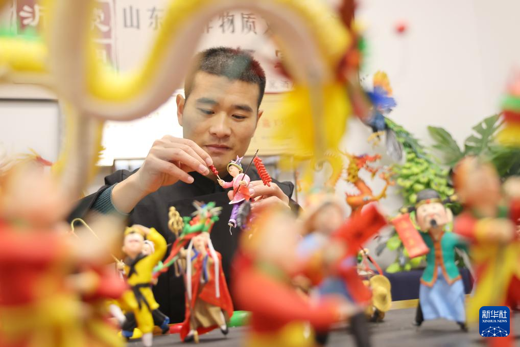 12月27日,在山东省临沂市技师学院,沂蒙面塑传承人韩红元在修整“龙娃迎春”面塑作品。