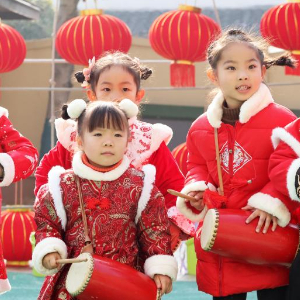 12月27日,浙江省湖州市德清县乾元镇第一幼儿园的孩子们在打腰鼓迎新年。