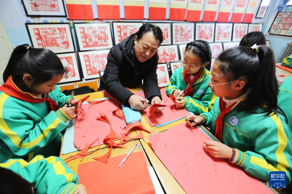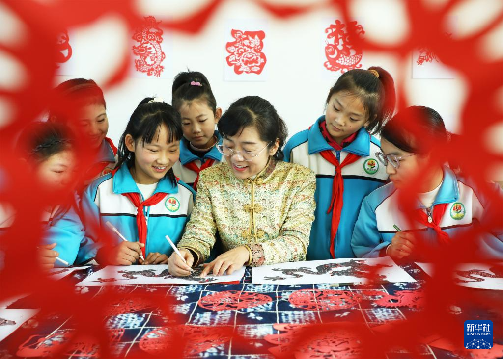 12月27日,在河北省唐山市丰润区左家坞镇仰山小学,剪纸艺人葛英(中)在教学生创作“龙年”主题剪纸作品。