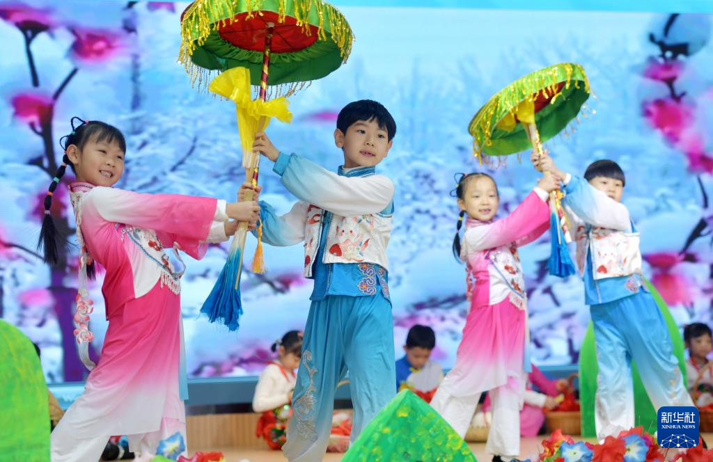 12月26日,河北省石家庄市井陉县第三幼儿园的小朋友表演“井陉拉花”迎新年。