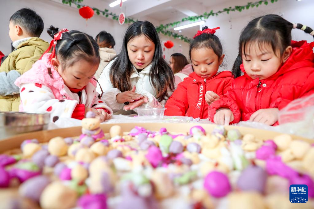 12月27日,四川省华蓥市杜家坪幼儿园的小朋友与家长一起做年糕。