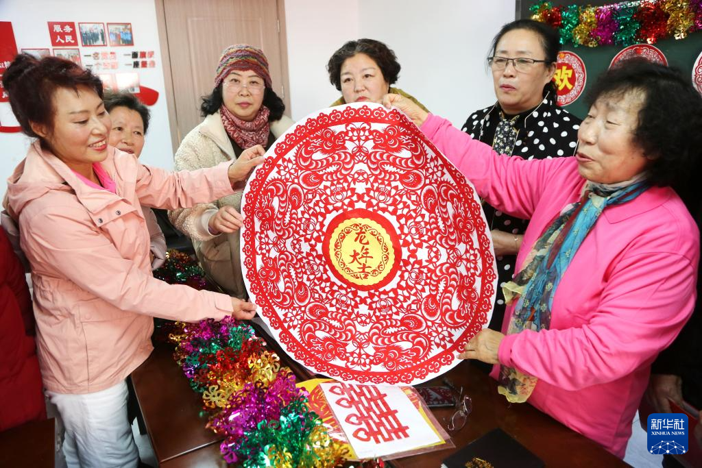 12月27日,剪纸爱好者在江苏省连云港市连云区院前社区展示剪纸作品。