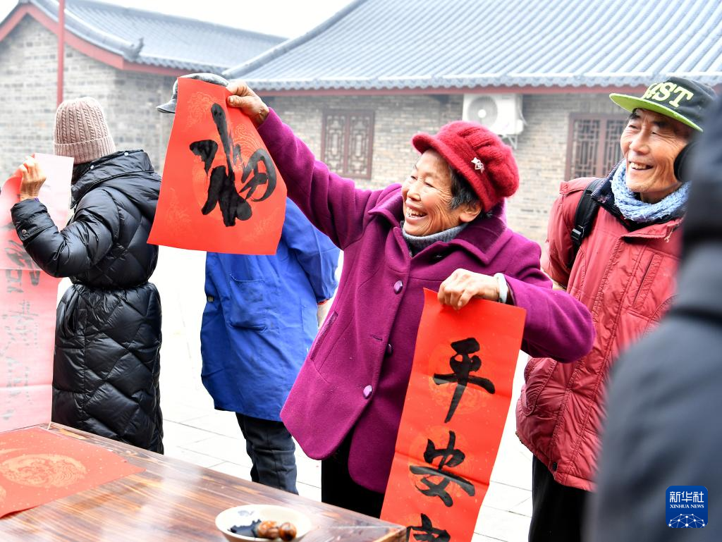 12月27日,四川省广安市前锋区广兴镇桥角村村民在领取春联和“福”字。
