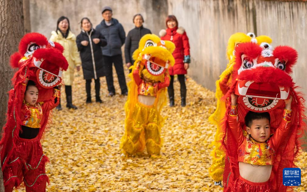 12月27日,四川省眉山市彭山区幼儿园的“幼萌宝舞狮队”为群众表演舞狮。