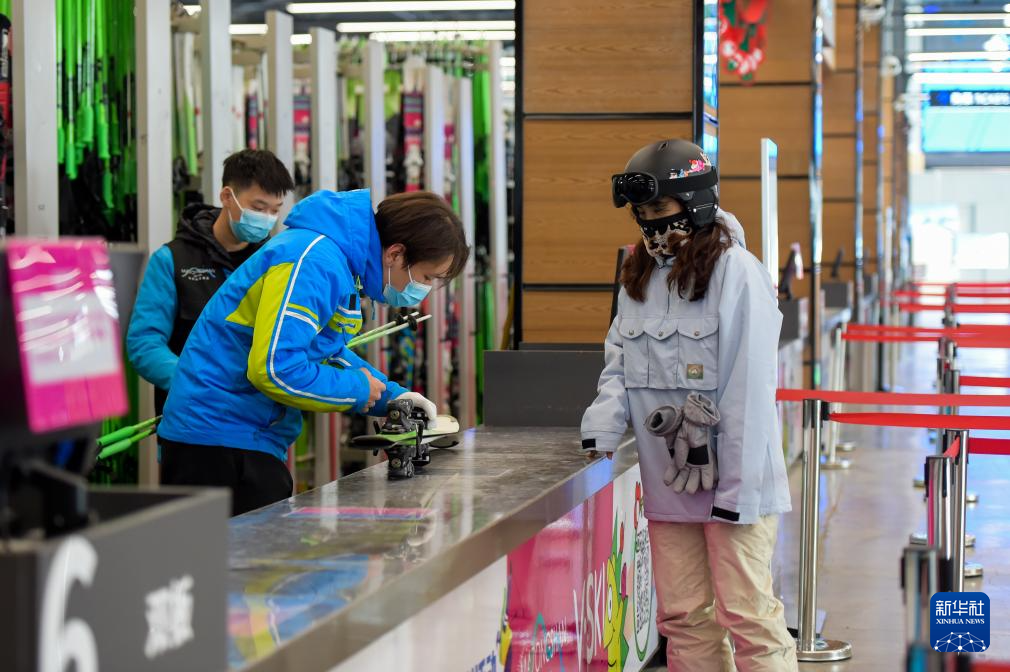 12月27日,呼和浩特市马鬃山滑雪场工作人员(左)为游客发放雪具。