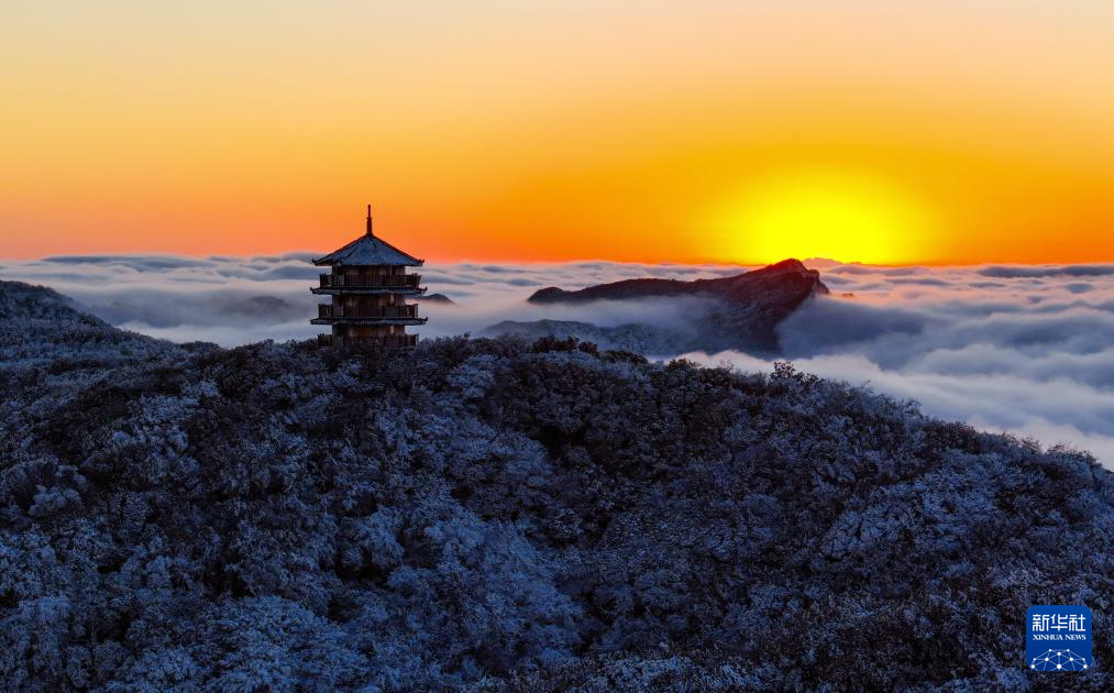 12月20日在重庆市南川区金佛山景区拍摄的雪后日落和云海景观(无人机照片)。