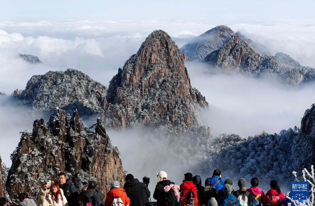 12月20日,游客在安徽省黄山风景区欣赏雪后美景。