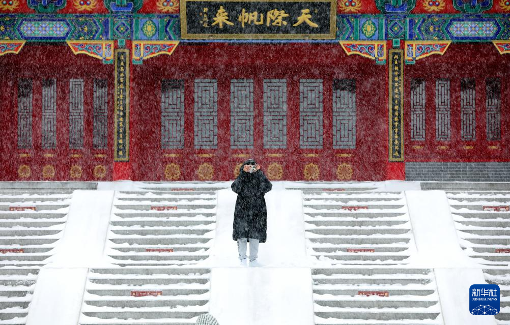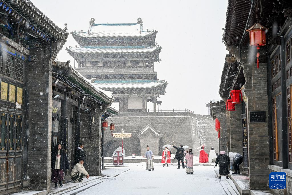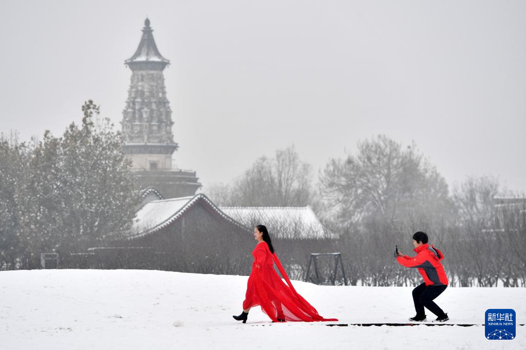 12月13日,在河北石家庄正定古城,游客在雪中拍照。