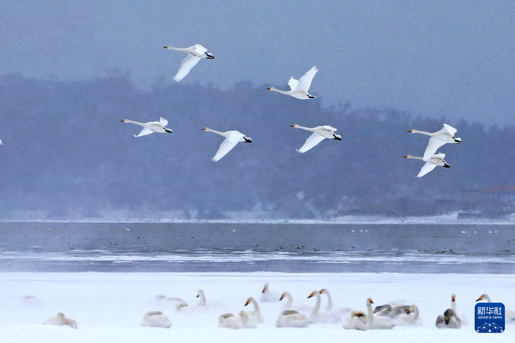 12月16日,在山东荣成大天鹅国家级自然保护区天鹅湖,一群大天鹅在雪中飞舞。