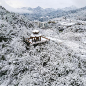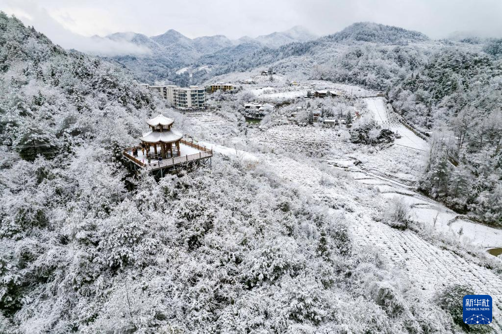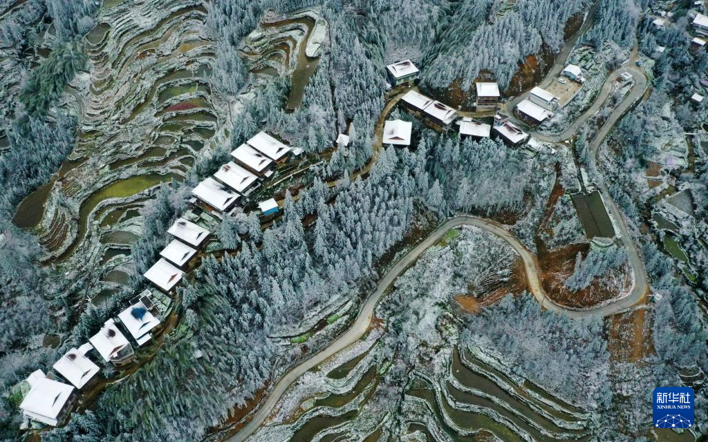 12月19日拍摄的广西融水苗族自治县杆洞乡尧告苗寨雪景(无人机照片)。
