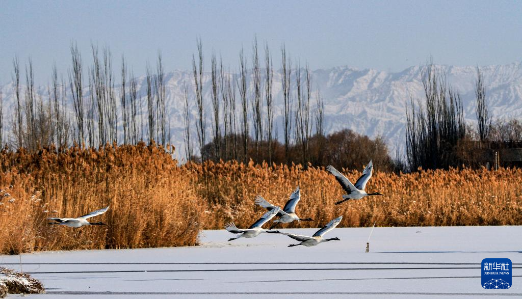 12月15日,几只丹顶鹤在甘肃张掖国家湿地公园飞翔。