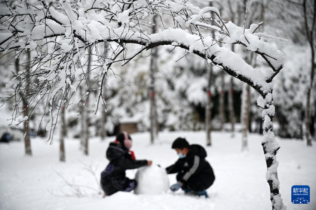 12月11日,在河南省沁阳市,两名小朋友在堆雪人。