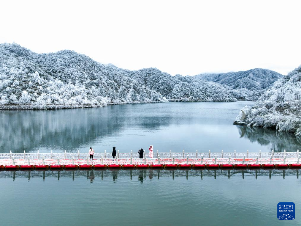 12月19日,游客在湖南省永州市双牌县阳明山国家森林公园万和湖景区赏雪游玩(无人机照片)。