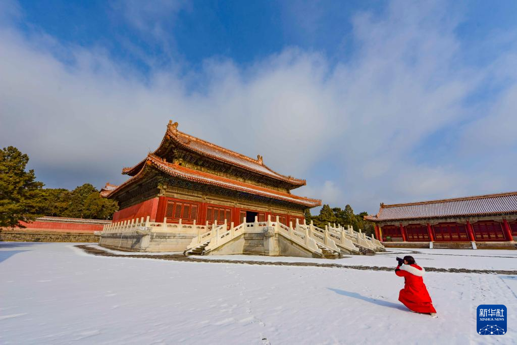 12月11日,游客在河北省遵化市清东陵景区拍摄雪景。