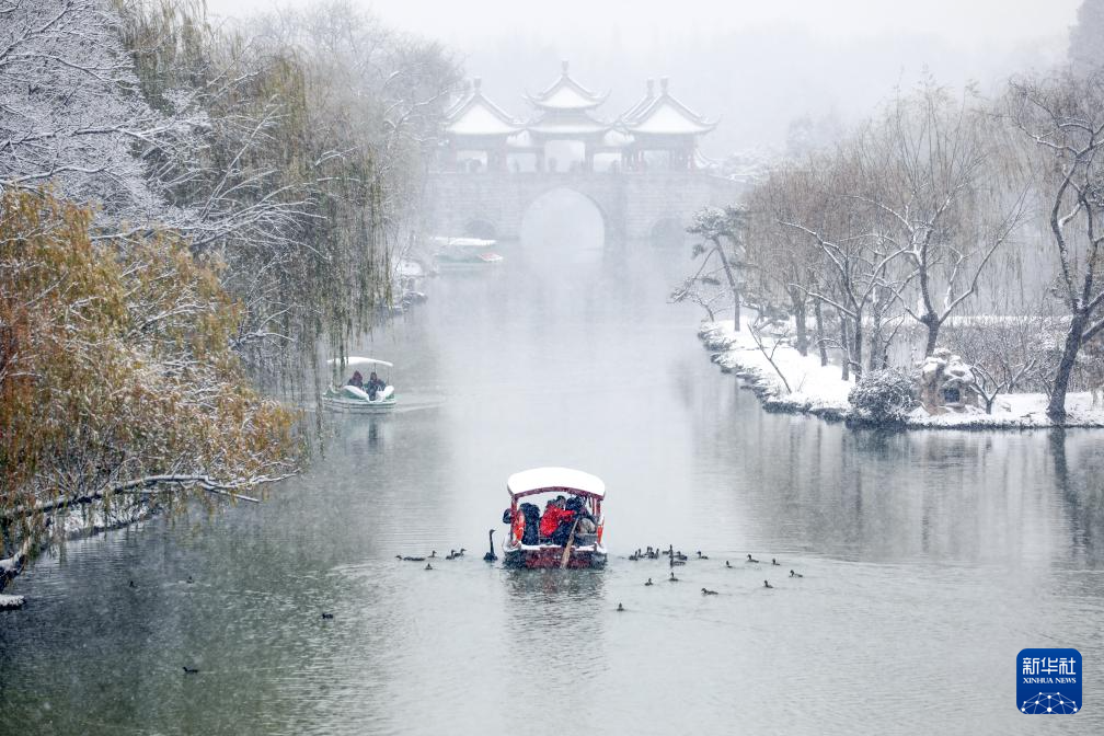 12月18日,在江苏省扬州市瘦西湖风景区,游客在雪中泛舟赏景。