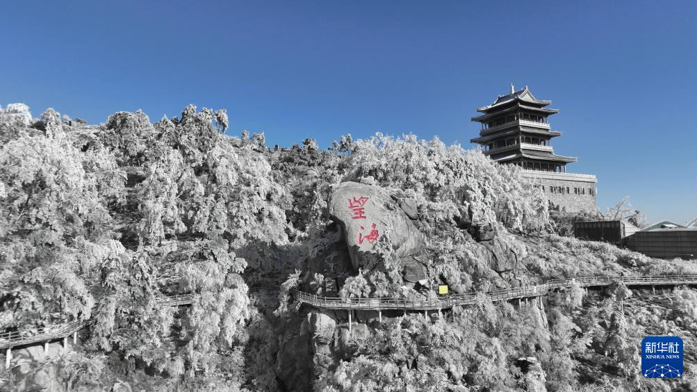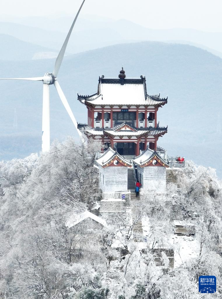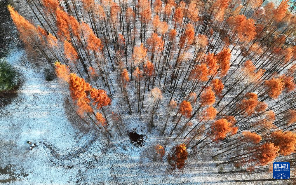 12月16日在湖南娄底涟源市龙山国家森林公园拍摄的雪景(无人机照片)。