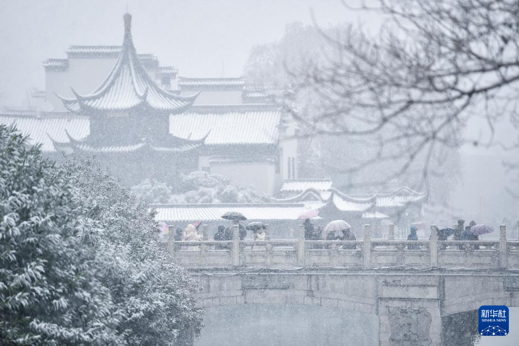 12月18日,人们在雪中游览江苏南京夫子庙景区。