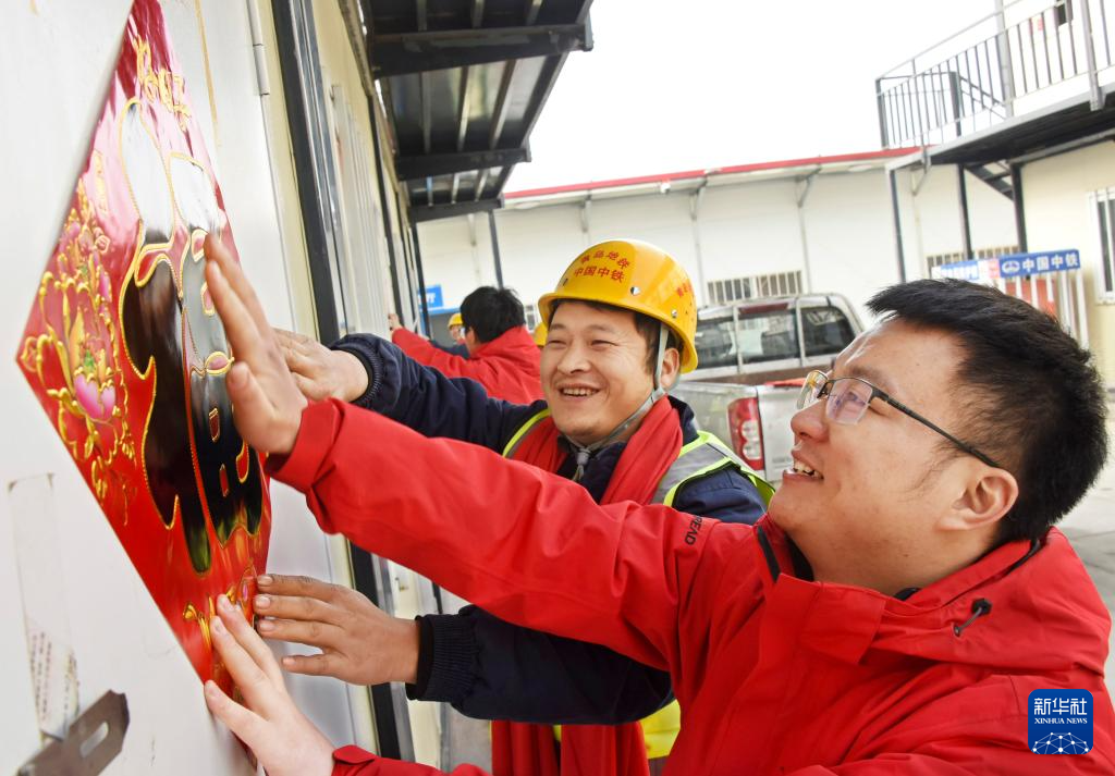 12月28日,在青岛地铁6号线一项目驻地,中铁二局职工在宿舍大门上张贴“福”字。