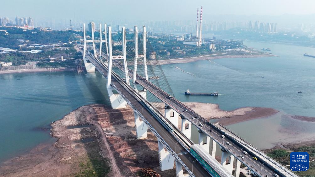 12月28日,列车行驶在重庆轨道交通18号线李家沱长江复线桥(无人机照片)。