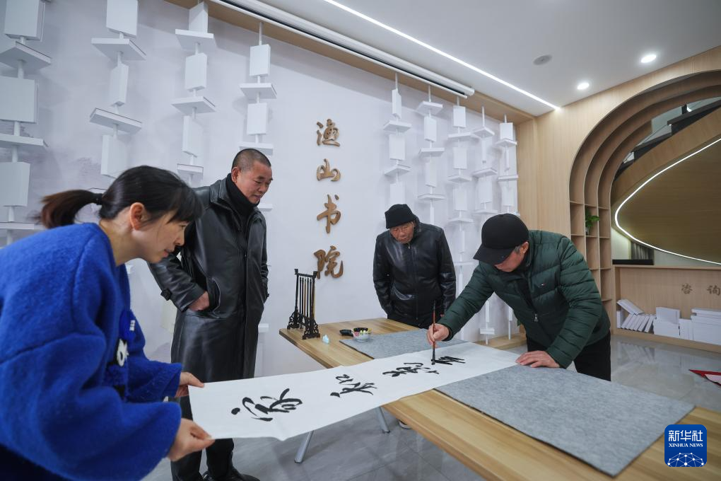 12月28日,当地村民在刚刚改造完成投入使用的诸暨市姚江镇山汀村渔山书院活动室内写书法春联。该书院是由村里老屋改造而成的农家书屋,设有农家书屋阅览室、文化活动室等。