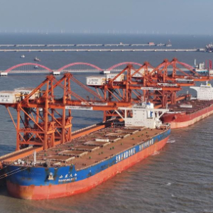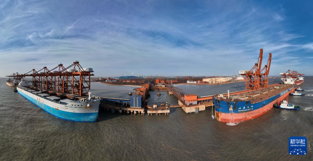 12月26日,两艘轮船靠泊在唐山港曹妃甸港区矿石码头卸载(无人机照片)。