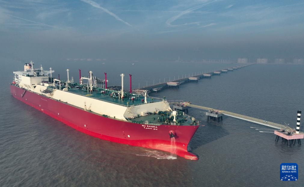 12月26日,一艘LNG船靠泊在唐山港曹妃甸港区LNG码头卸载(无人机照片)。
