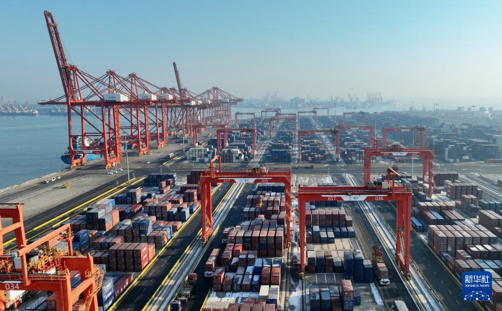 12月28日拍摄的唐山港京唐港区集装箱码头堆场(无人机照片)。
