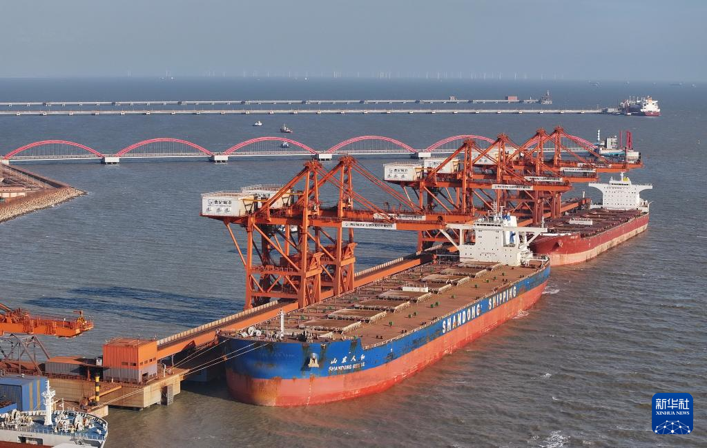 12月26日,一艘轮船(右)在唐山港曹妃甸港区矿石码头卸载后准备离港(无人机全景照片)。