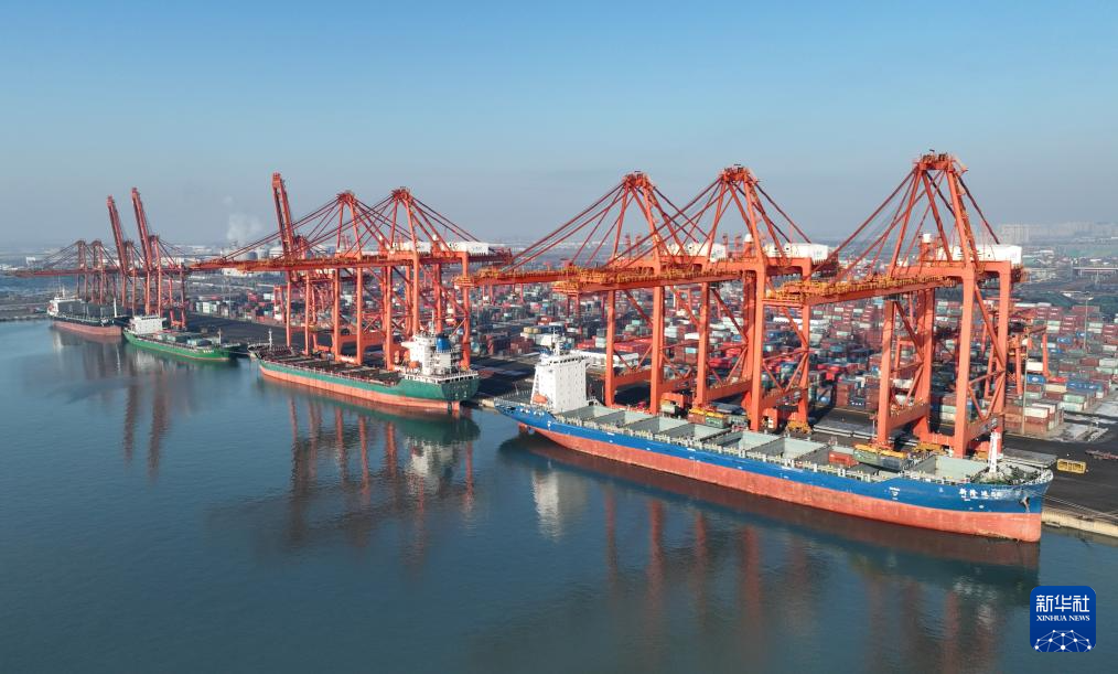 12月28日,多艘轮船靠泊在唐山港京唐港区集装箱码头装货(无人机照片)。