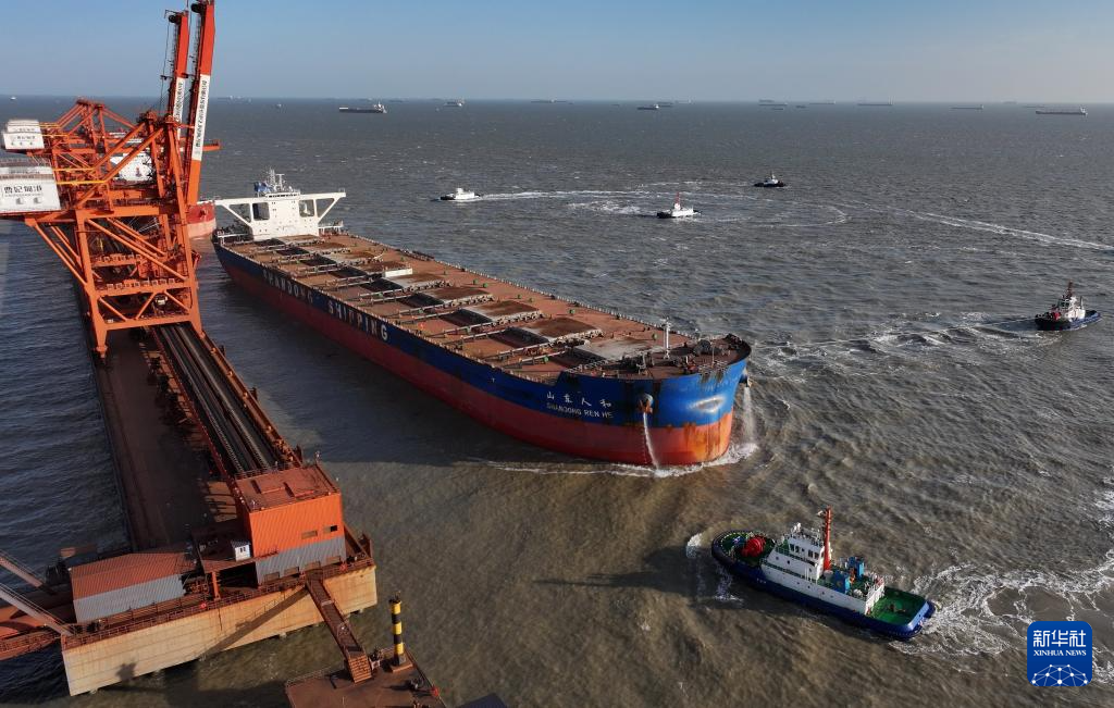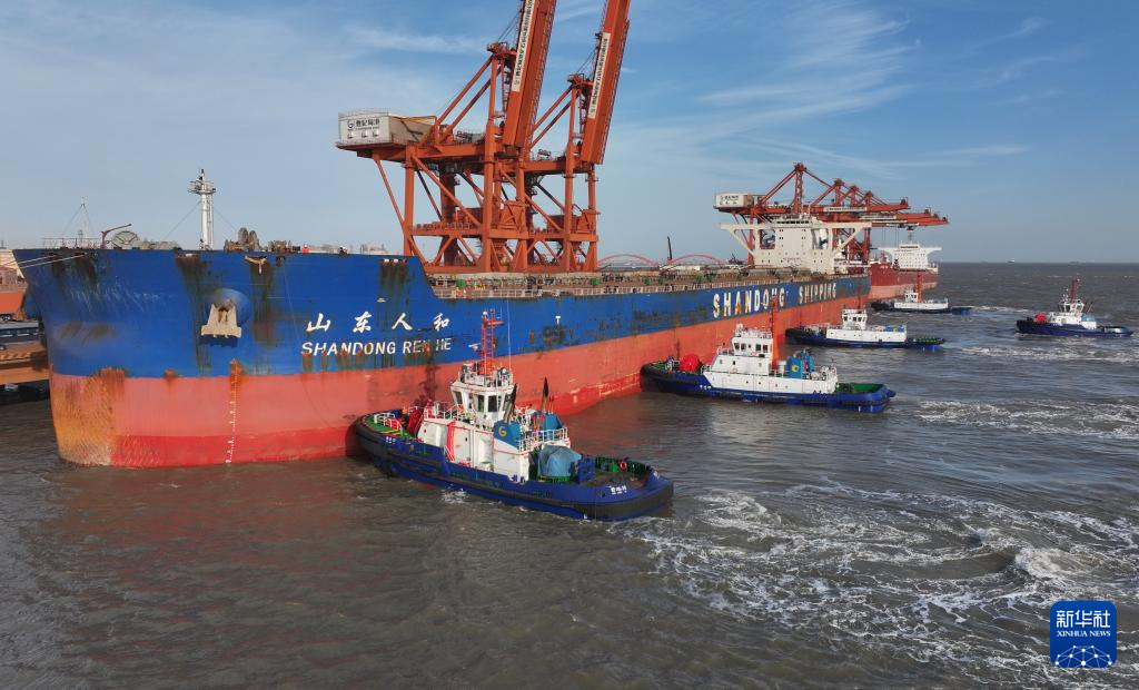 12月26日,一艘轮船在唐山港曹妃甸港区矿石码头卸载后准备离港(无人机照片)。